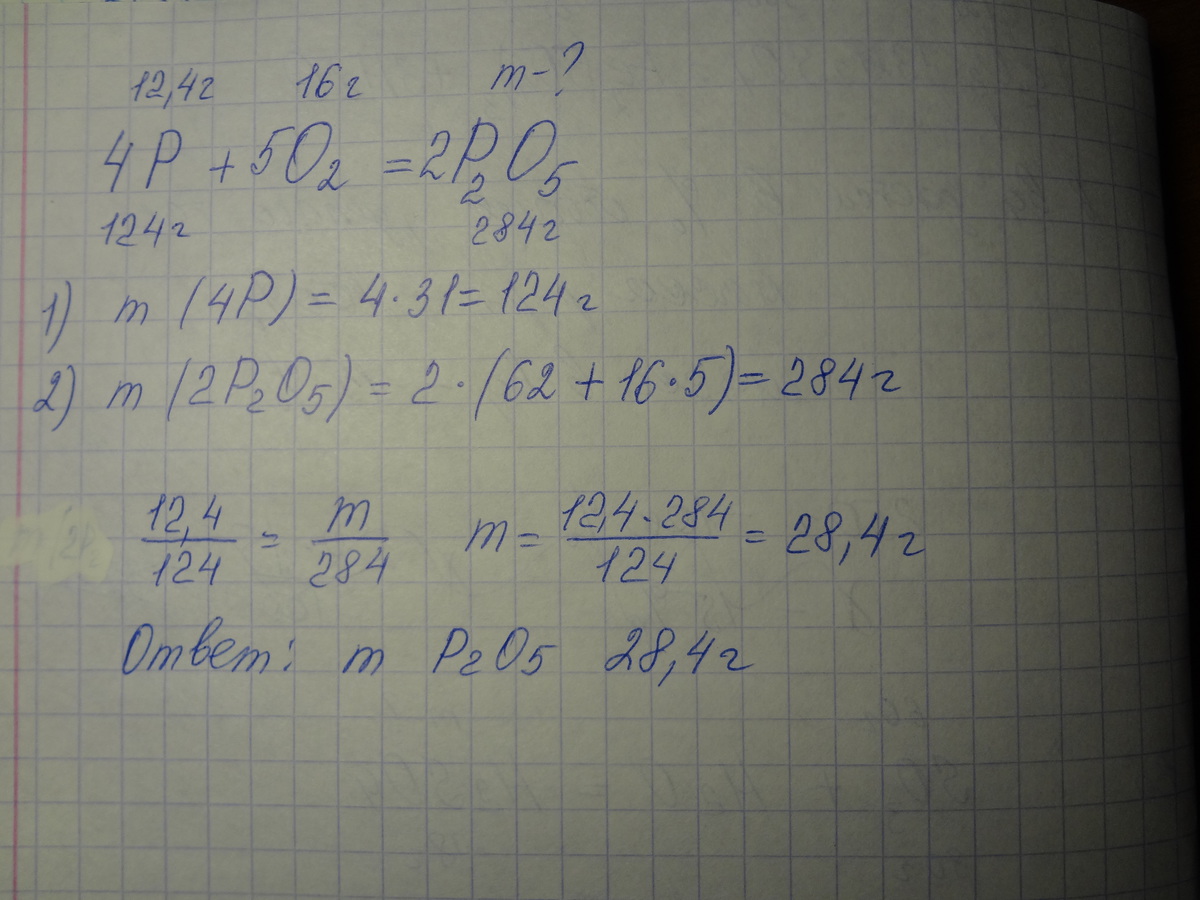 при спалюванні фосфору (P) масою 12,4 г витратився кисень(O2) масою 16 г і утворився фосфор(V) оксид. Визначте масу фосфору(V) оксиду