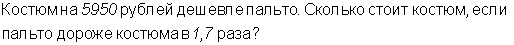 Допустим, что костюм стоит х, тогда пальто стоит 5950+х или 1,7х. Имеем уравнение: