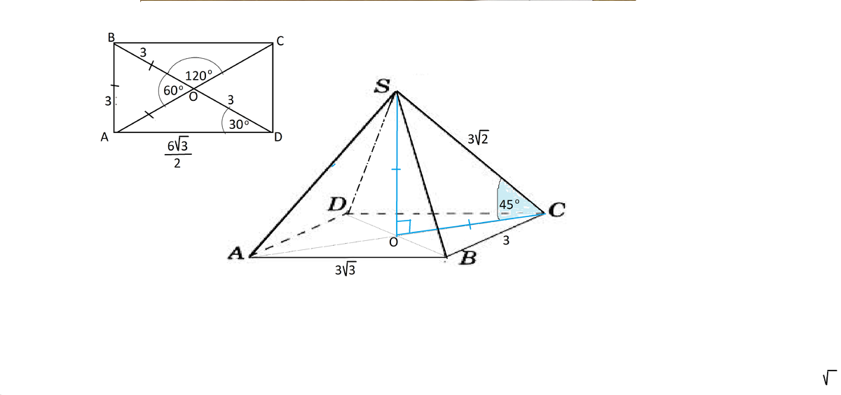 Основание пирамиды-прямоугольник с углом между диагоналями 120 градусов. Все боковые ребра пирамиды равны 3(корень из)2 см и наклонены к плоскости основания под углом 45 градусов. Найдите V пирамиды.