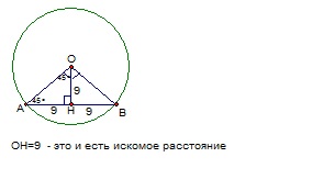 Помогите пожалуйста) : Хорда АВ равна 18 см. ОА и ОВ - радиусы окружности, угол АОВ=90 градусов. Найдите расстояние от точки О до хорды АВ.