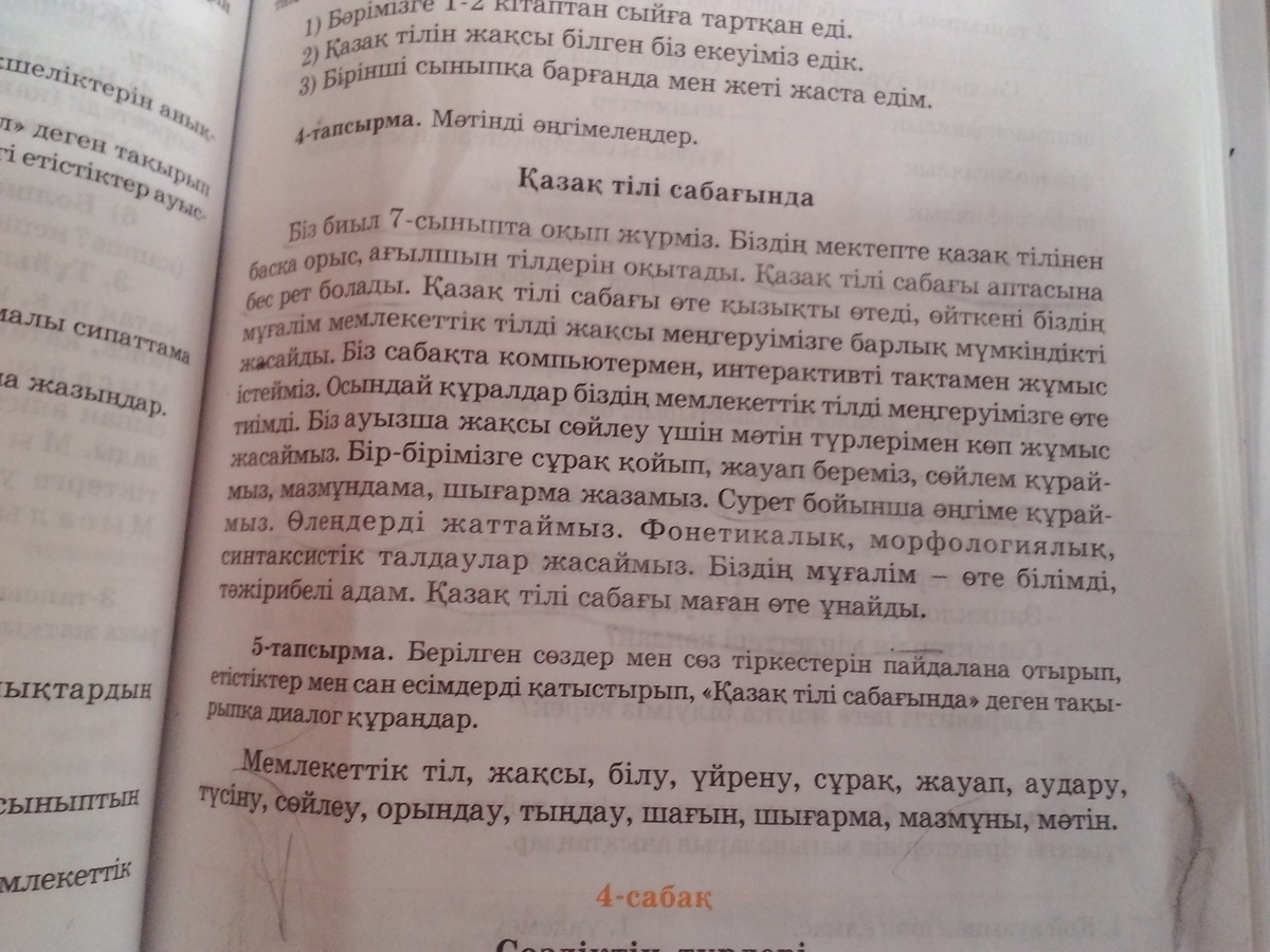 Мы в этом году учимся в 7ом классе. В нашей школе не только препадают казахский язык, но и русский тоже. Казахский язык в неделю бывает 5 раз. Урок казахского языка проходит интересно, наша учительница в прошлый урок объяснила о нашем национальном языке. С этих пор наши дети уважают и ценят наш язык. Так же чтобы хорошо разговаривать казахском языке мы выполняем разные упражнения. Составляем предложения, пословицы. Учим стихи. И изучаем фонетик, морфологию, делаем синтаксис. Наша учительница очень умная и опрятная женщина. Я очень люблю урок казахского языка.