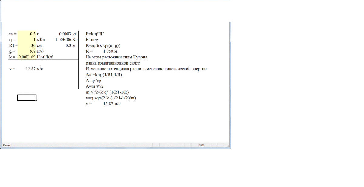 v=q·sqrt(2·k·(1/R1-1/R)/m)