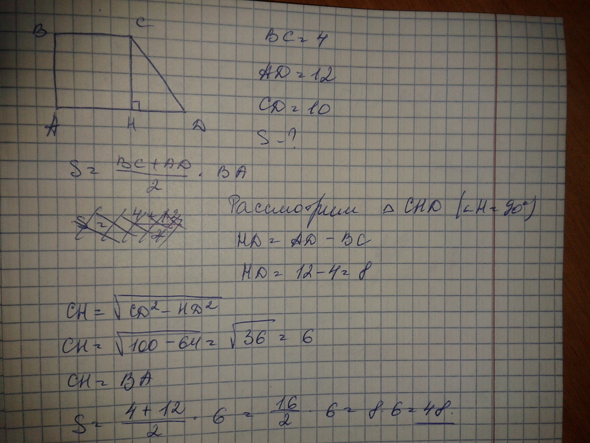 в прямоугольной трапеции основания равны 4 см и 12 см, а большаябоковая сторона - 10 см найдите площадь трапеции