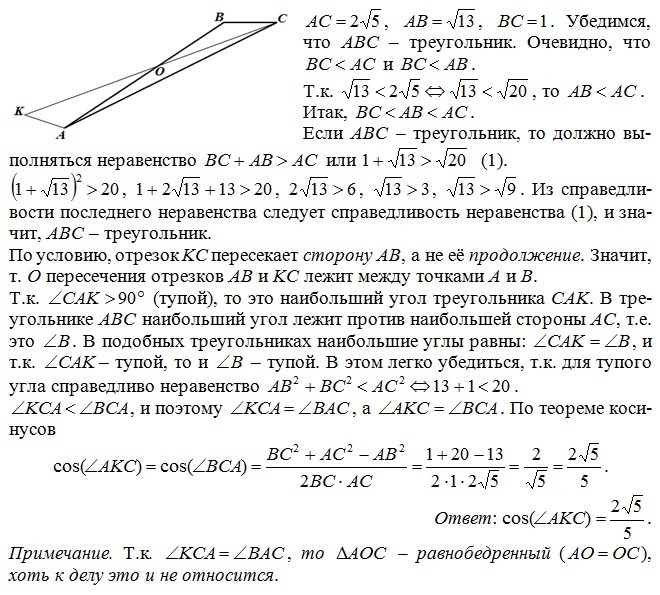 Стороны АС,АВ,ВС треугольника АВС равны 2 корня из 5, корень из 13 и 1 соответственно. Точка К расположена вне треугольника АВС, причем отрезок КС пересекает сторону АВ в точке,отличной от В. Известно,что треугольник с вершинами К, А и С подобен исходному.найдите косинус угла АКС, если угл КАС > 90 градусов