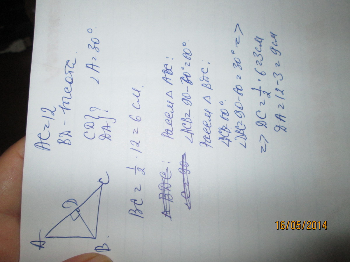 в прямоугольном треугольнике ABC гипотенуза AC равна 12 см. BD - высота этого треугольника. Найдите CD и DA, если угол А = 30 градусов