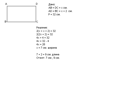 1. Одна из сторон прямоугольника на 2 см больше другой, а периметр прямоугольника равен 32 см. Найди стороны прямоугольника.