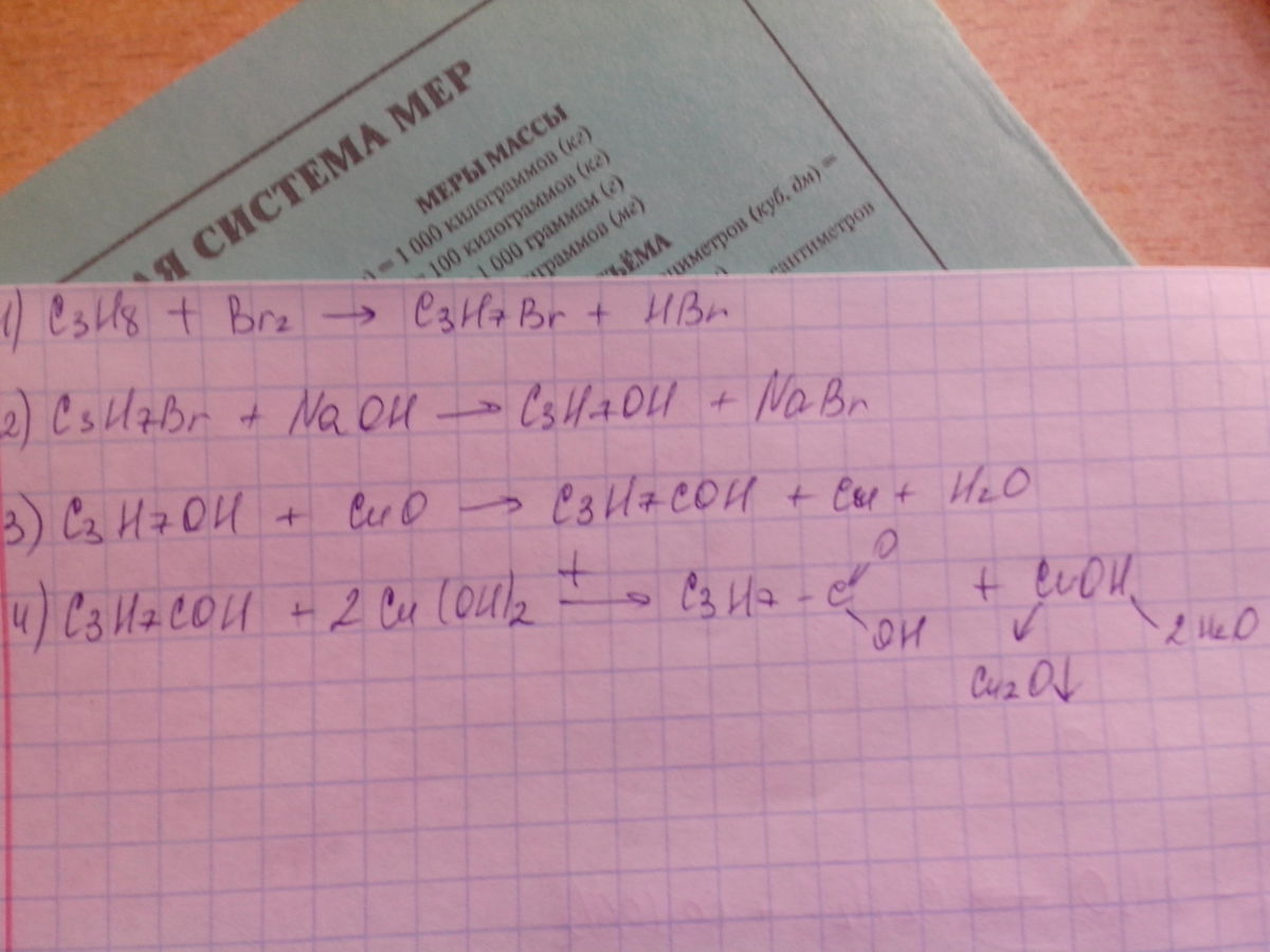 напишите уравнение реакции при помощи которых можно осуществить превращения по схеме C3H8-C3H7Br-C3H7OH-C3H7COH-C3H7COOH-(HCOO)2Ca