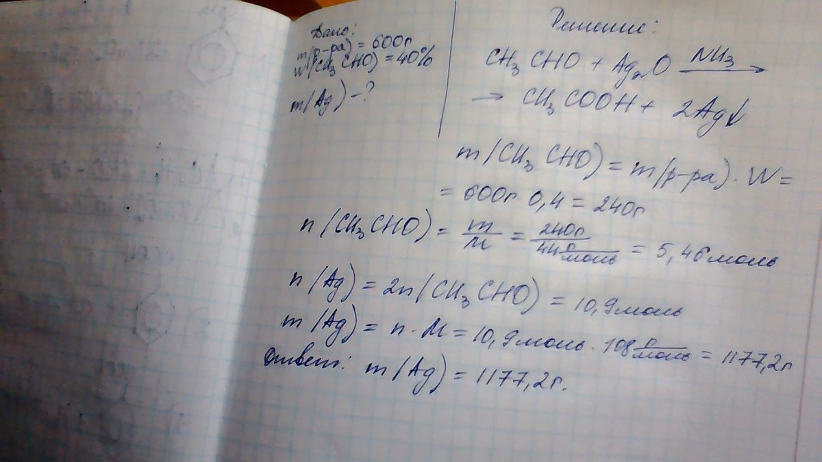 Рассчитайте массу металлического серебра, полученного при окислении 600г. 40% раствора ацетальдегида аммиачным раствором оксида серебра.