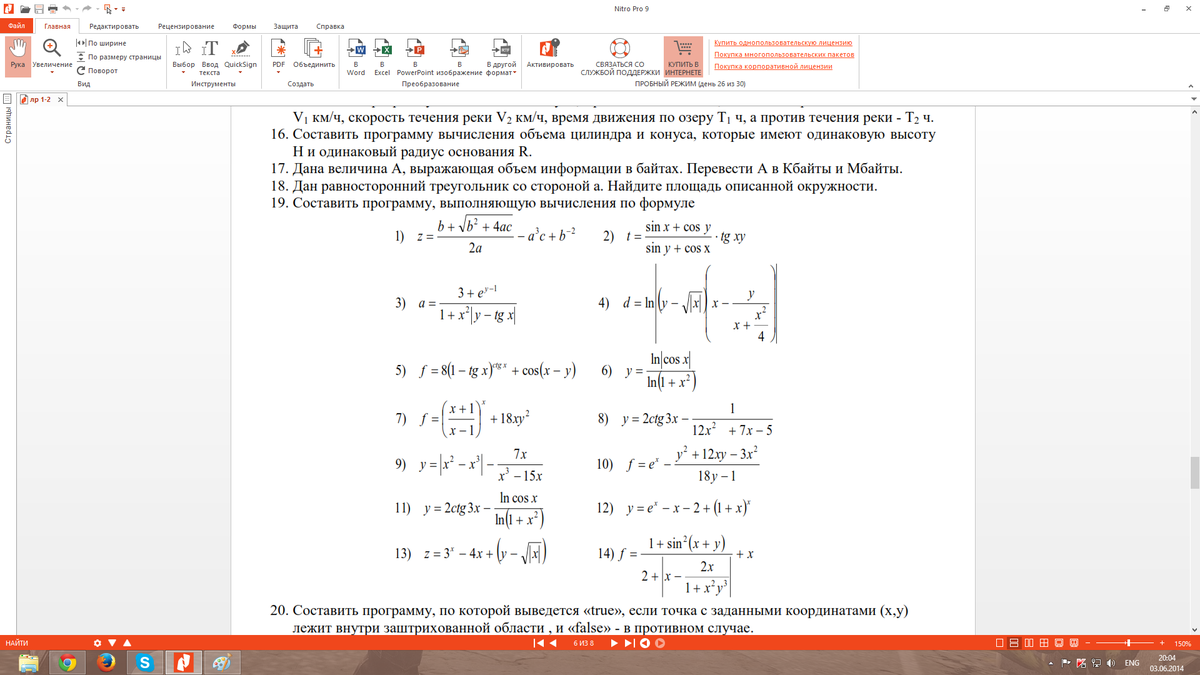 writeln('a = ', (3 + power(e, y - 1)) / (1 + sqr(x) * abs(y - tan(x))));