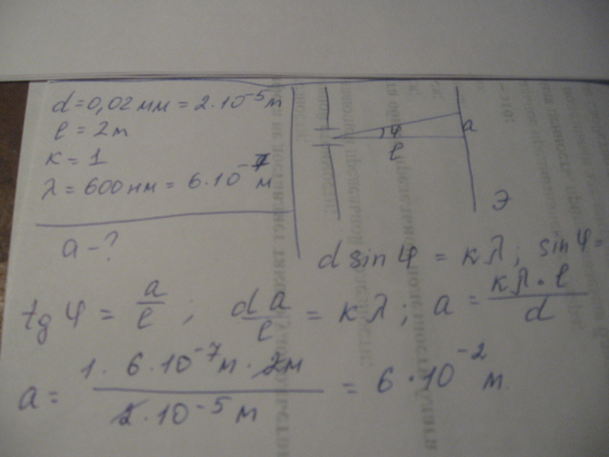 Период дифракционной решетки равен 0,02мм, расстояние от решетки до экрана 2м. Каково расстояние между максимумами нулевого и первого порядка если на решетку нормально падает свет с длинной волны 600 нм ?