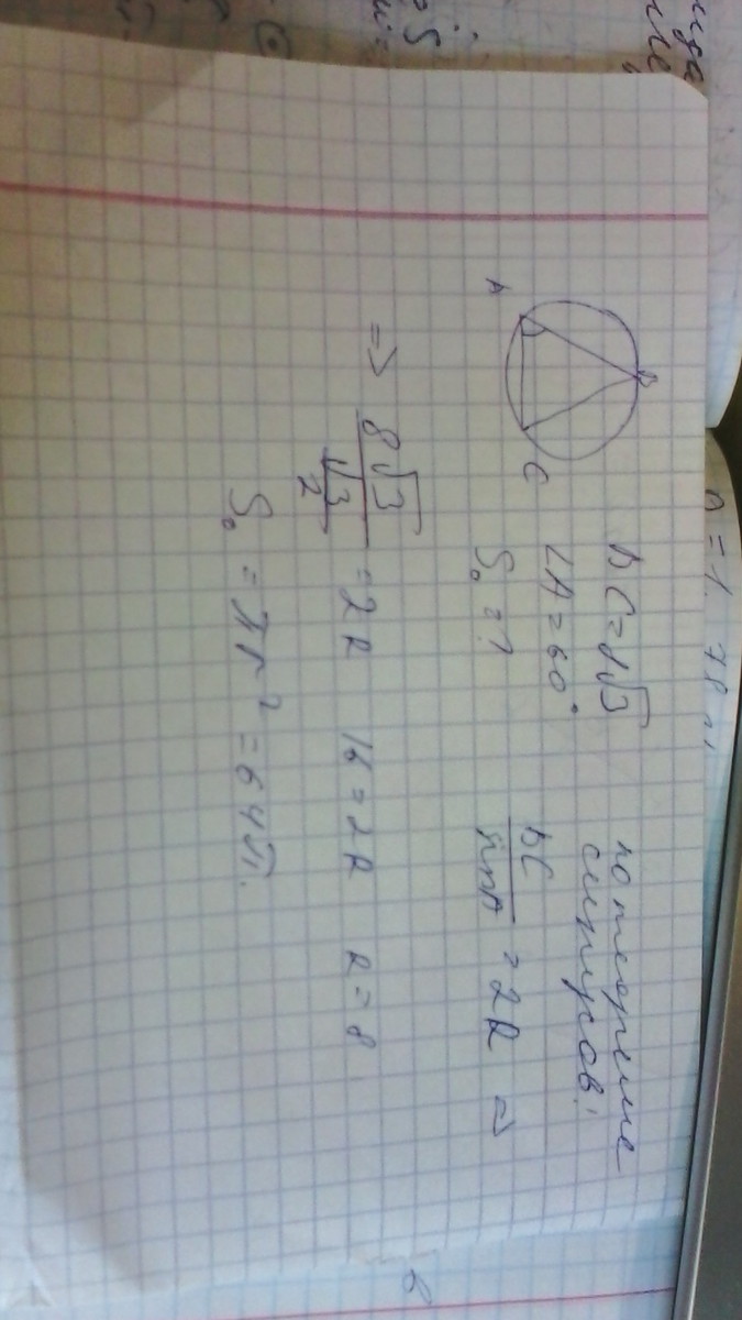 Найдите площадь круга ,ограниченного окружностью ,описанной около треугольника ABC , у которого угол A= 60 градусов,BC=8√3 см ! ! !