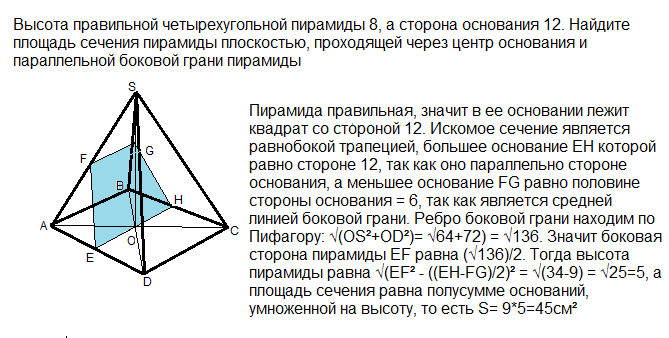 Пирамида правильная, значит в ее основании лежит квадрат со стороной 12. Искомое сечение является равнобокой трапецией, большее основание EH которой равно стороне 12, так как оно параллельно стороне основания, а меньшее основание FG равно половине стороны основания = 6, так как является средней линией боковой грани. Ребро боковой грани находим по Пифагору: √(OS²+OD²)= √64+72) = √136. Значит боковая сторона пирамиды EF равна (√136)/2. Тогда высота пирамиды равна √(EF² - ((EH-FG)/2)² = √(34-9) = √25=5см, а площадь сечения равна полусумме оснований, умноженной на высоту, то есть S= 9*5=45см²