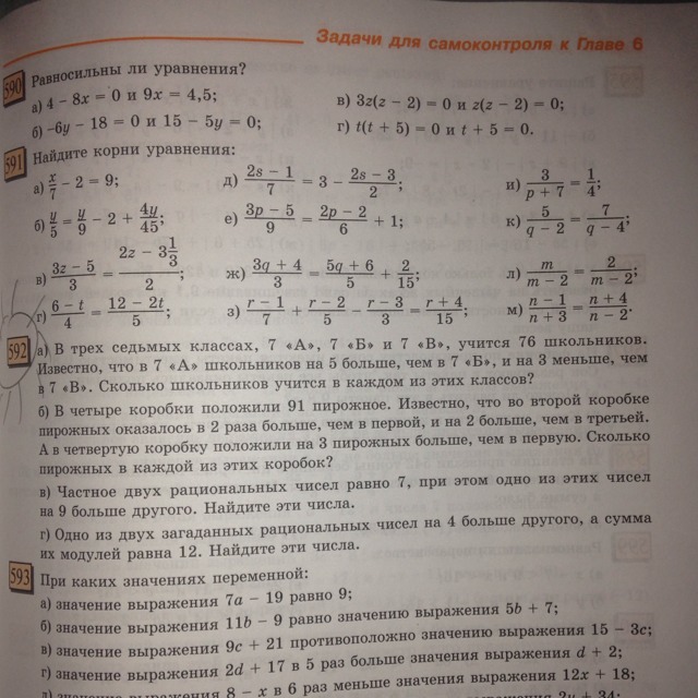 592. а) В 7"А" - х уч., в 7"Б" - х-5, в 7"В"- х+3.