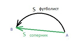 У соперника путь и перемещение совпадают, у футболиста отличаются: путь длиннее, чем перемещение.