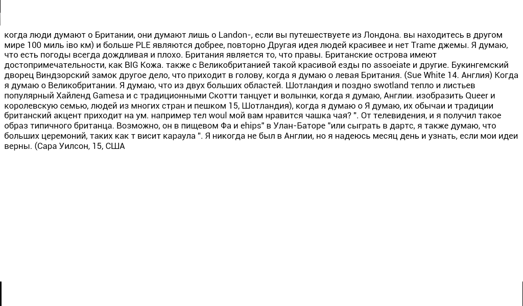 Когда я думаю о Британии, я представляю две крупных части, Шотландию и Англию. У меня, Шотландия ассоциируется тёплой с дружелюбными людьми и популярными Горными Играми* и фестивалями с традиционными Шотландскими танцами и волынками.* ...Когда я думаю об Англии, я представляю Королеву и Королевскую Семью, людей с разных стран и футбол. (Марни Дункан, 15, Шотландия)