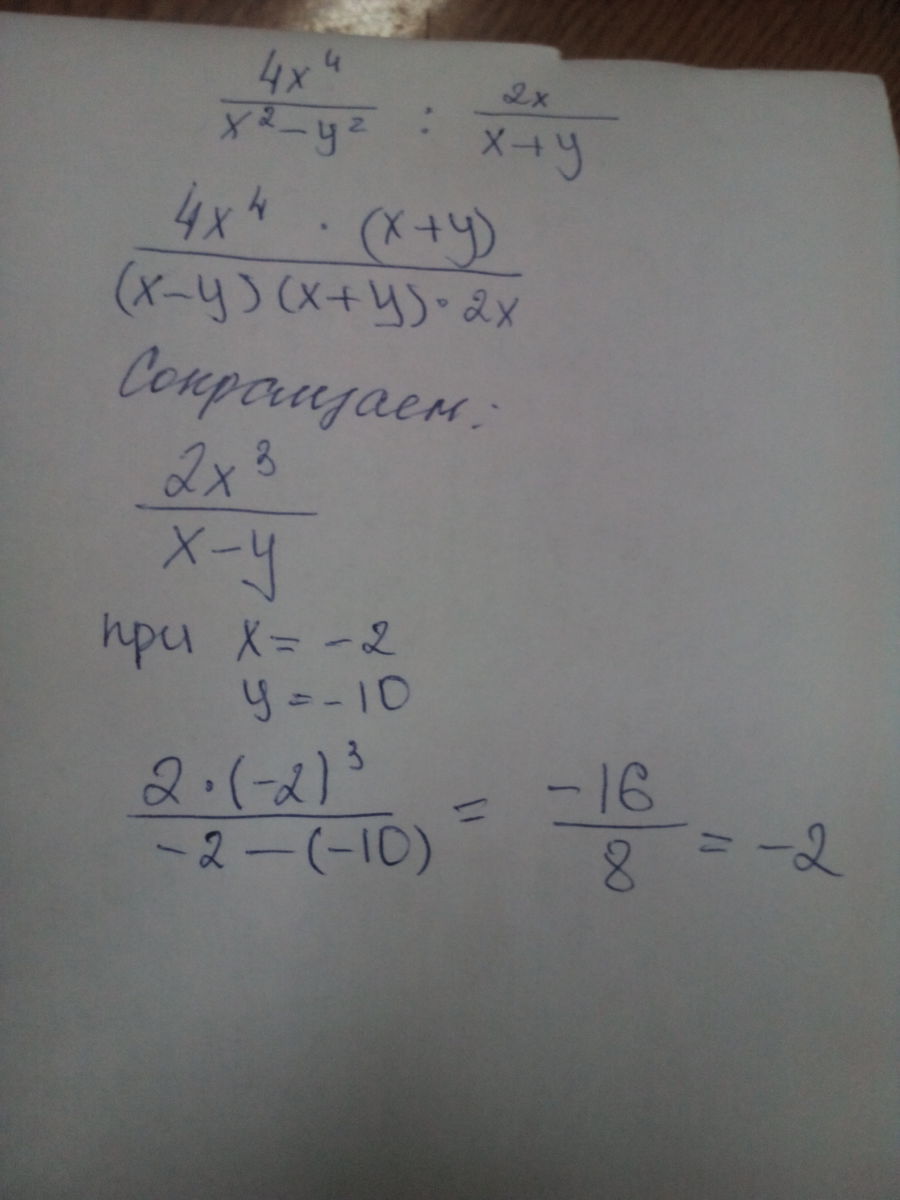 4x^4/(x^2-y2) : 2x/(x+y) = 2x^3/(x-y) = 2*(-2)^3/((-2)-(-10)) =2*(-8)/(-2+10) = -2
