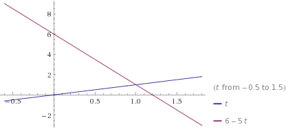 график пересекает ось ОX в точке (0; 6) , а ось Оt в точке (6/5; 0)