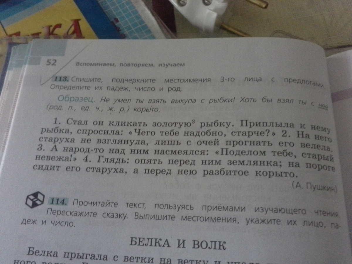 Стал он кликать золотую рыбку. Приплыла к нему(Д. п., ед. ч., м. р.) рыбка, спросила: Чего тебе нодобно , старче? На него (В. п., ед ч, м р,) старуха не взглянула, лишь с очей прогнать его велела. Глядь: опять перед ним(Т п, ед ч, м р)землянка; на пороге сидит его(Р п, ед ч, м р) старуха, а перед нею разбитое корыто.