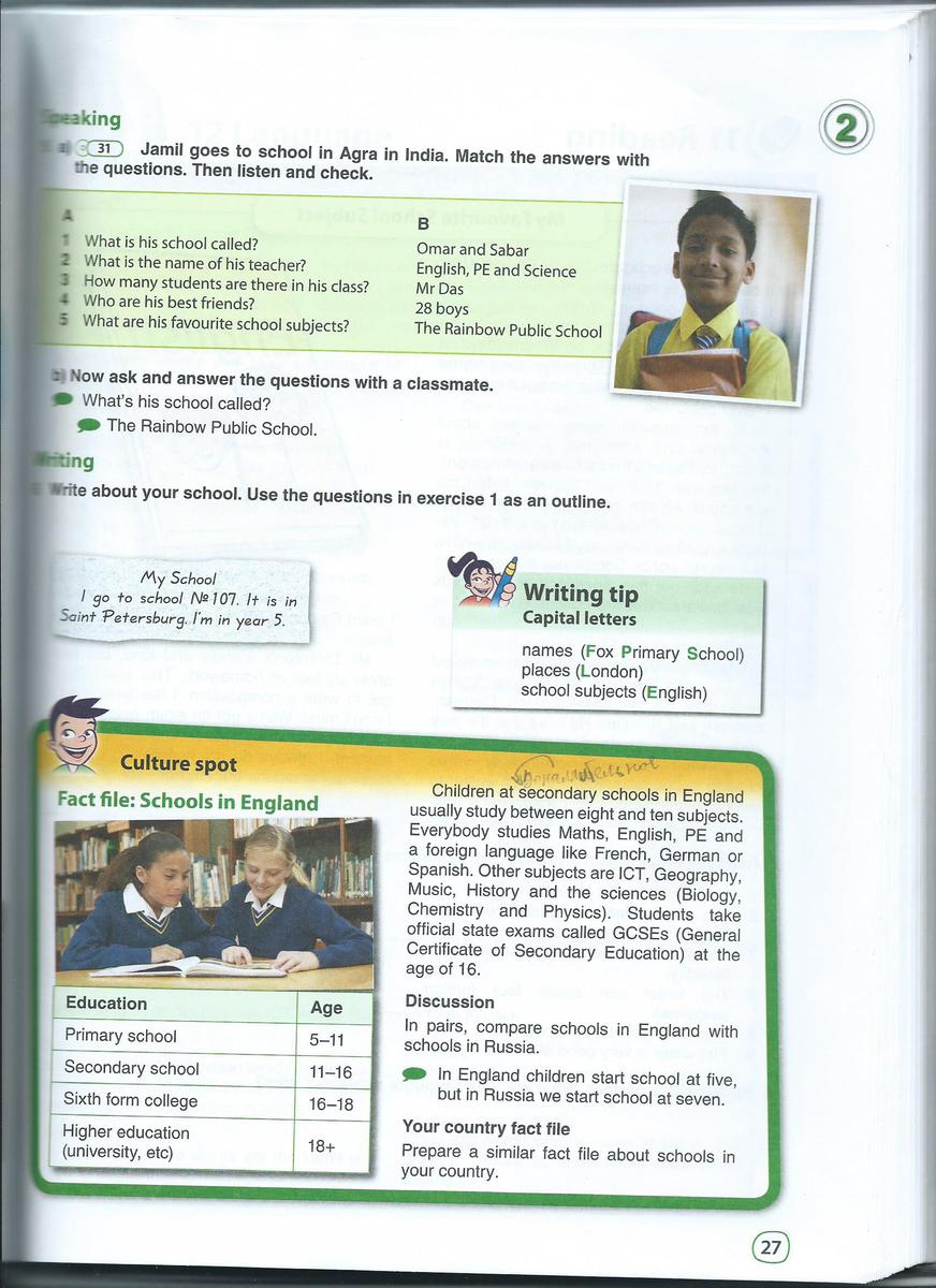 дети в средней школе в Англии обычно изучают от восьми до десяти предметов. Каждый изучает математику, английский, физкультуру и иностранный языки, такие, как французский, немецкий и испанский. Другие предметы это информатика,география, музыка, история и науки(биология, химия, физика). Ученики сдают официальный экзамен ГССШ(Генеральный сертефикат средней школы) в 16 лет