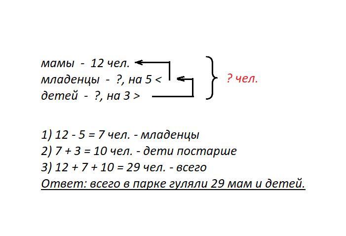 В парке гуляли 12 мам, младенцев на 5 меньше, а детей постарше на 3 больше, чем младенцев. Сколько мам и детей гуляло в парке?