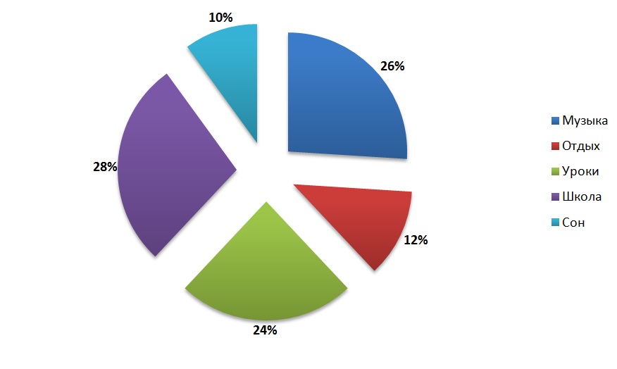 составь режим своего дня построить круговую и столбчатую диаграммы.1) музыка-26%