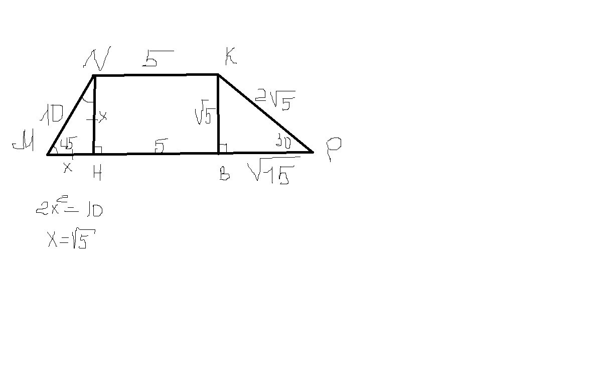 В трапеции MNKP угол М=45 градусов,угол P=30 градусов,МN=10 см,а меньшее основание 5 см