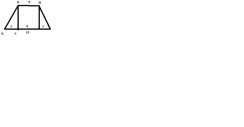 Опустим высоты от концов меньшего основания, расстояние между ними и концами большего основания (13-9)/2=4/2=2см.