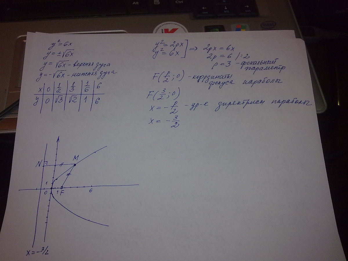 Построить параболу y^2=6x. Найти: