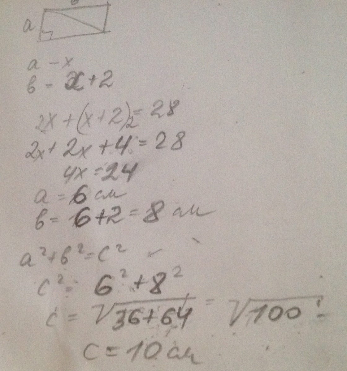 Одна сторона прямоугольника на 2см длиннее другой, а его периметр равен 28см. Найти его диагональ (чертить ненадо)