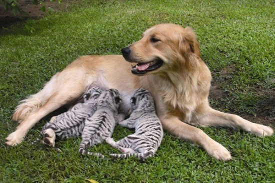 В жизни ,стала свидетелем удивительной истории.Молодая тигрица жила в вольере и каждый вечер,во время обхода сторожа ,она подходила к сетке и внимательно следила за сторожевыми собаками.Однажды приехал ветеринар и тигрица заволновалась ,мурча она ходила около входа в вольер.Причина волнения тигрицы появилась чуть позже,её привёл хозяин-ветеринар.Большая,пушистая пастушья собака примчалась к вольеру и когда её впустили,она облизала морду тигрицы,которая тёрлась о неё и мурлыкала,как котёнок.Оказалось,тигрица с 2-х месяцев росла в доме ветеринара и воспитала тигра эта собака , принявшая её ,как родного щенка.Тигрица выросла,но нежные чувства остались и у неё,и у приёмной мамы.Животные не способны на обман и предательство,они умеют быть преданными и любить бескорыстно.Своих детёнышей или приёмных, они воспитывают очень ответственно и не важно,что порой они совсем не похожи на своих родителей.