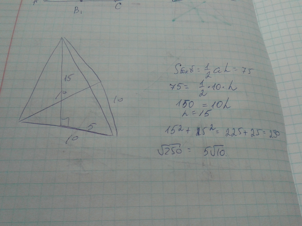 Найдите ребро правильной треугольной пирамиды,если площадь её боковой поверхности равна 75см,а сторона основания 10см