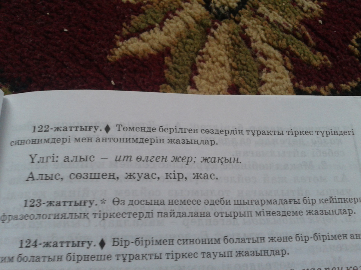 122 жаттығу төменде берілген сөздердің тұрақты тіркес түріндегі синонимдерді мен антонимдерді жазыңдар үлгі: алыс-ит өлген жер;жақын. Алыс,сөзшең,жуас,кір,жас.