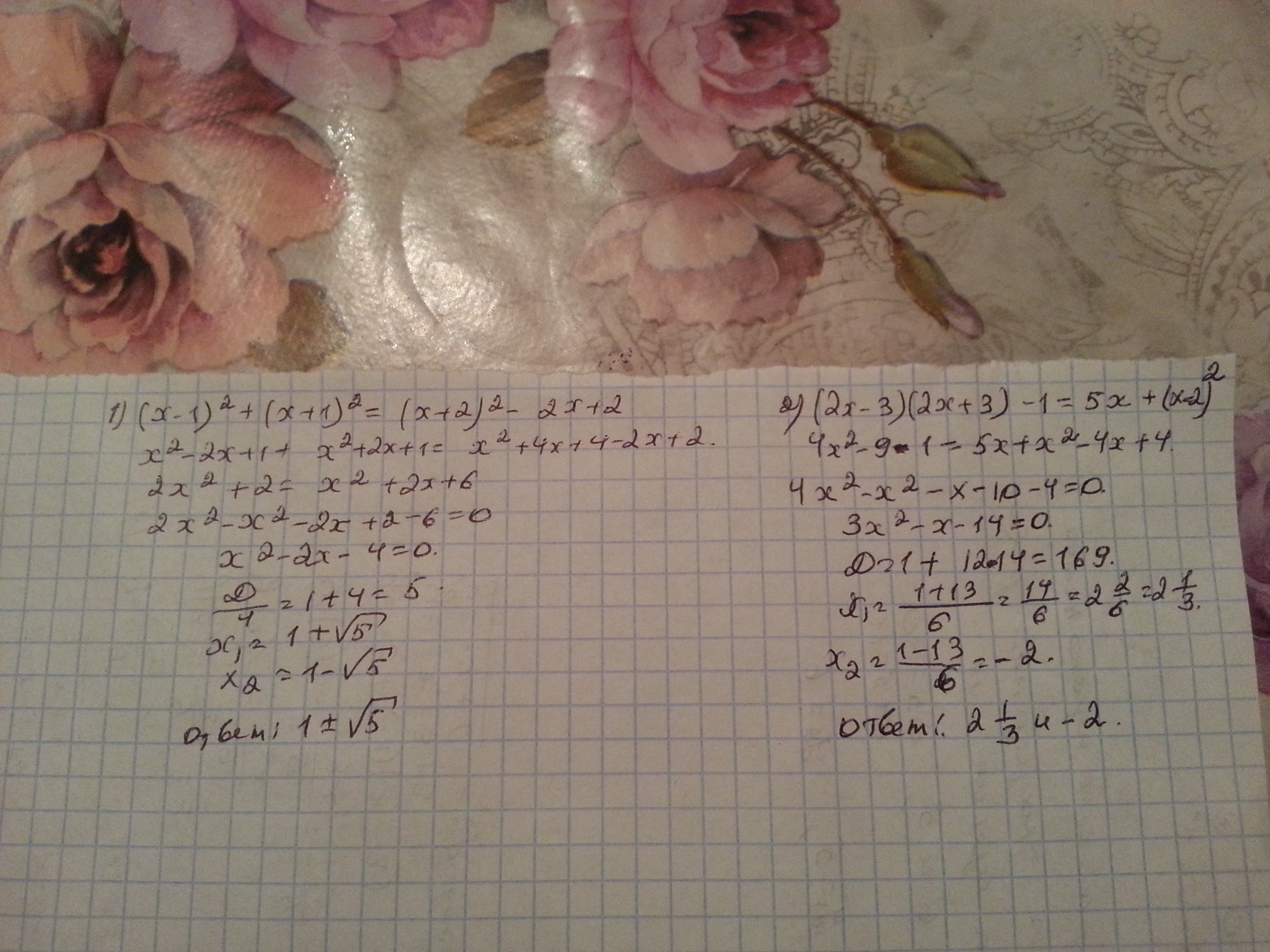 1) (x-1)^2+(x+1)^2=(x+2)^2-2x+2
