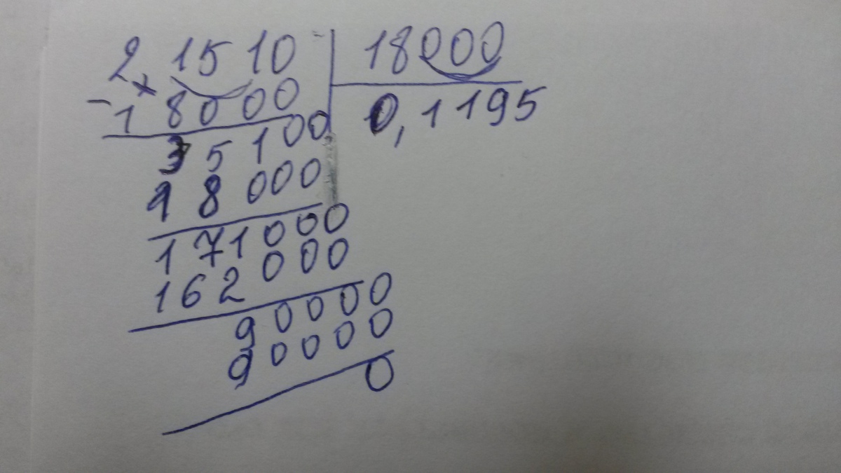 2,151:18 смотрим сначала на цифру перед запятой,2 на 18 не делится,значит пишем 0 а после 0 пишем запятую,пока выходит 0,
