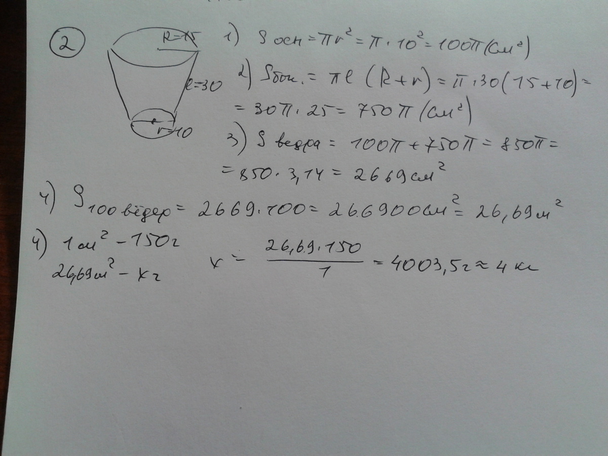 S(покраски 1 ведра) = 2·S(бок)+2·S( нижнего осн.)=2·750·π+2·100·π=1500·π+200·π=1700·π кв см=0,17·π м²