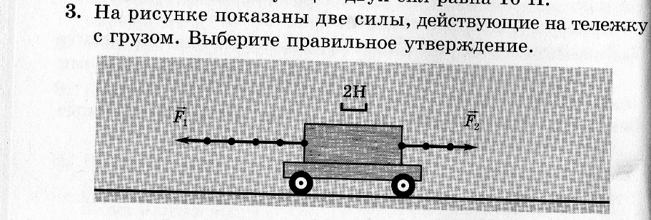 На рисунке показаны две силы,действующие на тележку с грузом. Выберите правильное утверждение.