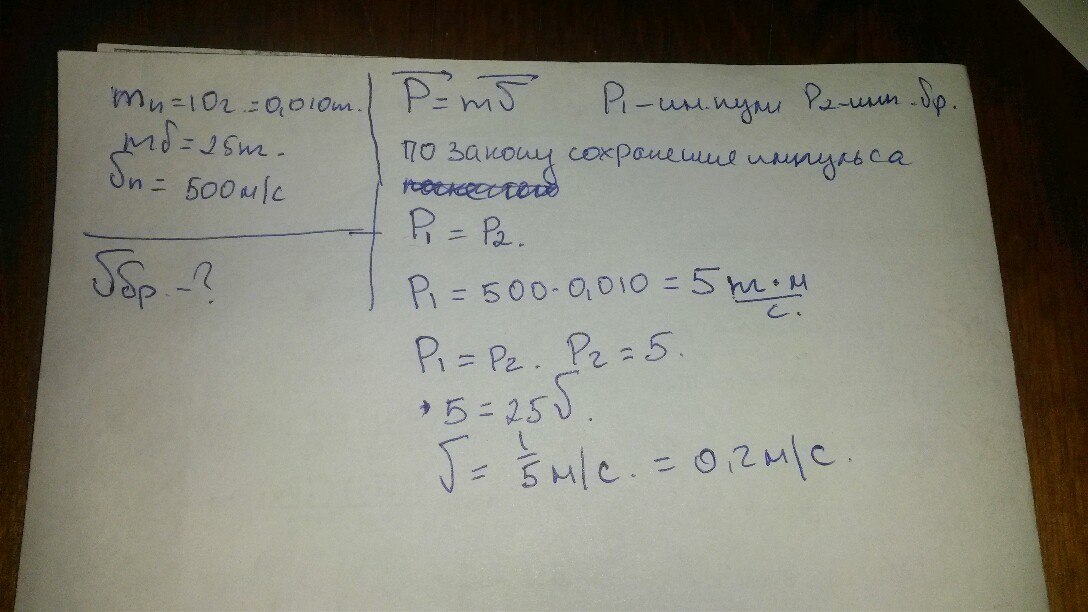 Какую скорость приобретет деревянный брусок, если в нем застрянет горизонтально летящая пуля? Масса пули 10 г, скоростью 500м/с, масса бруска 25 кг. Трение бруска о пол не учитывайте.