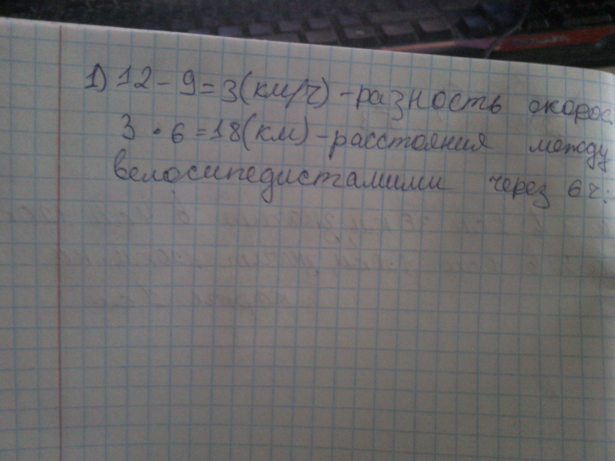 Из одного села в одном направлении одновременно выехали два велосипедиста .Один ехал со скоростью 12 кмч ,а второй 9 кмч . Какое расстояние будет между ними через 6 ч после начала движения?