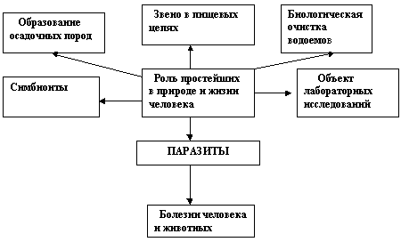 Простейшие — источник питания других животных. В морях и в пресных водах простейшие, прежде всего инфузории и жгутиконосцы, служат пищей для мелких многоклеточных животных. Черви, моллюски, мелкие ракообразные, а также мальки многих рыб питаются преимущественно одноклеточными; без простейших их существование было бы невозможным. Этими многоклеточными животными в свою очередь питаются более крупные животные, и прежде всего подрастающие мальки рыб. Понятно, какое огромное значение имеют простейшие в жизни природы и в народном хозяйстве.