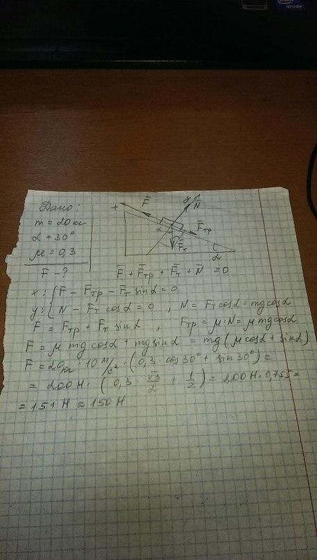 ящик массой 20 кг равномерно перемещают вверх по наклонной плоскости под углом 30 градусов. Какую силу прикладывают к ящику в направлении движения, если коэффициент трения между ним и плоскостью равен 0,3?