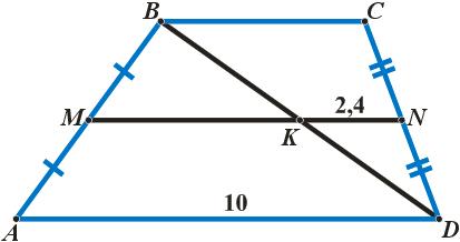 рассмотрим треугольник ВДС. если КN-средняя линия треугольника то ВС=2КN=4.8 рассмотрим трапецию АВСД у него MN- средняя линия то MN=ВС+АД/2=4.8+10/2=7.4