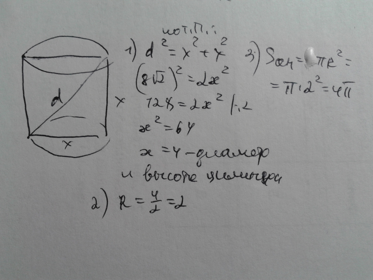 Найдите площадь основания цилиндра, если осевое сечение цилиндра квадрат диагональ которого 8√2