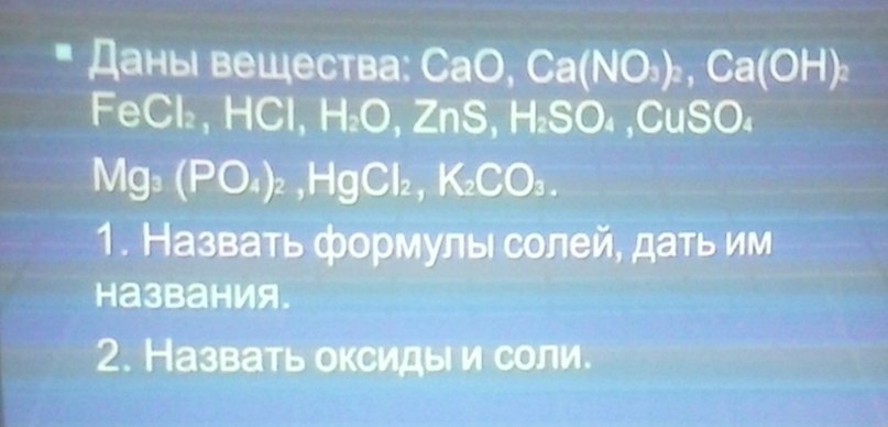 ОКСИД кальция,нитрат кальция,гидроксид кальция,хлорид железа (2),соляная КИСЛОТА,вода,цинковая обманка (сульфат цинка),серная КИСЛОТА,сульфат меди,ортофосфат магния,хлорид ртути,карбонат калия.