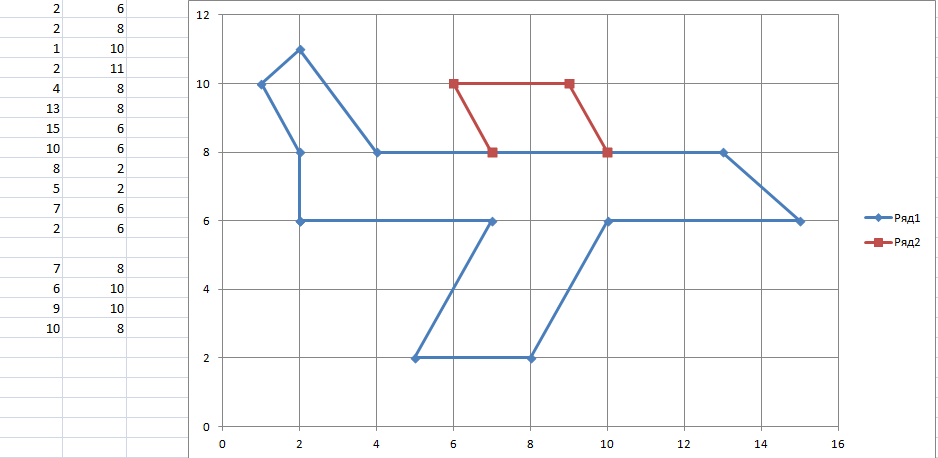 Задание 4 Отметьте точки: 1(2,6), 2(2,8), 3(1,10), 4(2,11), 5(4,8), 6(13,8), 7(15,6), 8(10,6), 9(8,2), 10(5,2), 11(7,6), 12(7,8), 13(6,10), 14(9,10), 15(10,8). Соедините точки: 1 – 2 – 3 – 4 – 5 – 6 – 7 – 8 – 9 – 10 – 11 – 1. 12 – 13 – 14 – 15. Ответ: что получилось?Киньте рисунок с тем как вы это сделали!