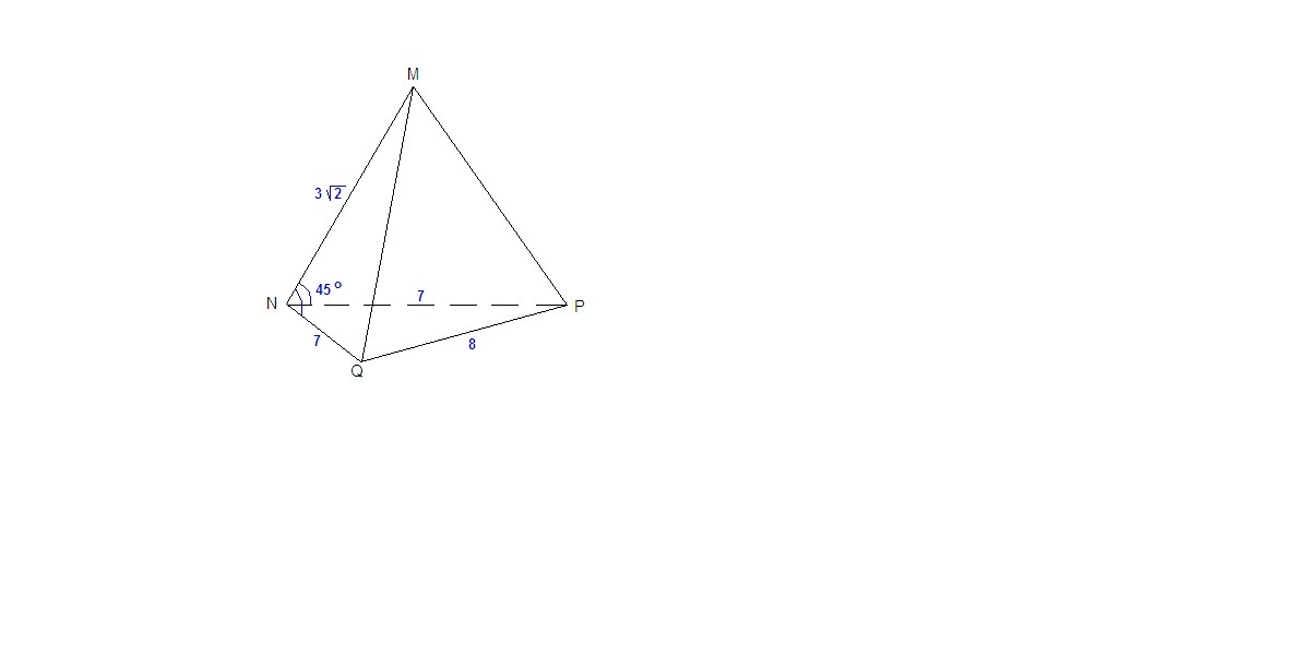 В тетраэдре MNPQ ребро MN=3 корня из 2 см, NP=NQ=7 см, PQ=8см, угол MNP= угол MNQ = 45 градусов . найдите площадь грани MPQ.