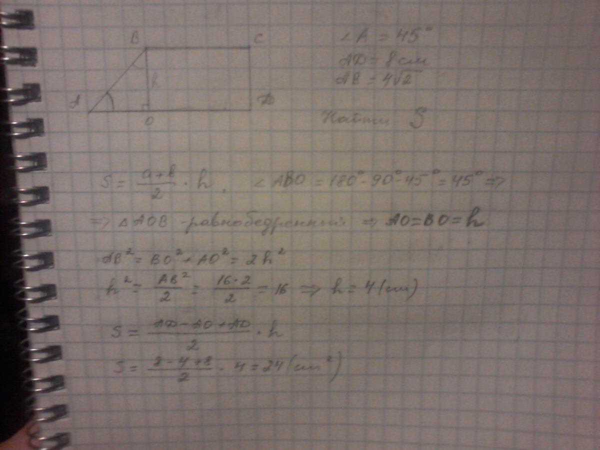 Острый угол А прямоугольной трапеции ABCD равен 45 градусам. Большее основание трапеции равно 8 см,а большая боковая сторона равна 4 корней из 2 см. Найдите площадь трапеции.