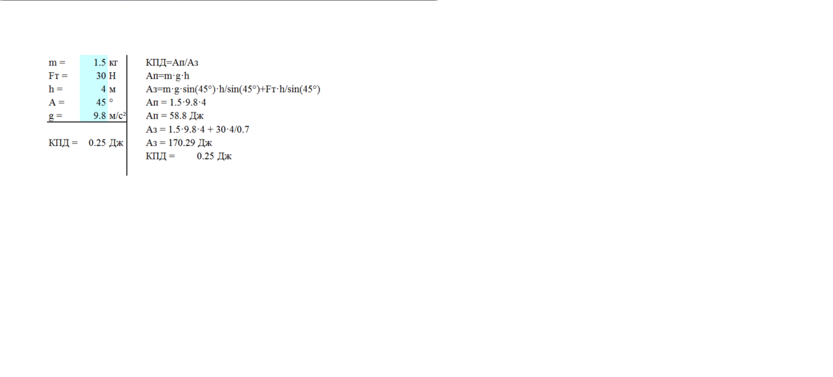 Найти КПД наклонной плоскости, если m=1,5кг; Fт.= 30Н; h=4м; уголальфа=45 градусов
