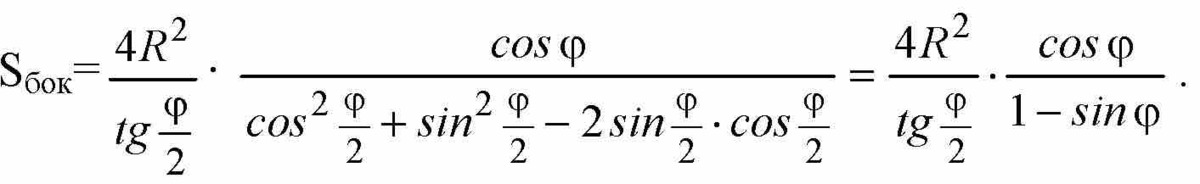 Sбок = (4·R²/(tg(α/2)) · Cosα/(1-sinα).