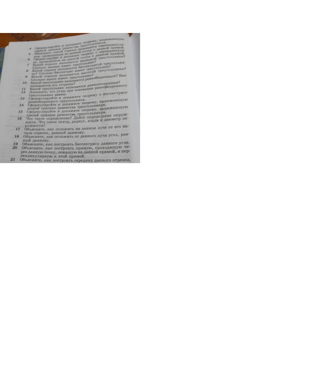 Треугольник-это геометрическая фигура, состоящая из 3 точек, не лежащих на одной прямой, соединеных отрезками. Периметр треугольника-это сумма длин трёх его сторон. Треугольники называются равными, если их можно совместить наложением. Теорема-высказывание, требующее доказательства.