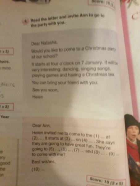 1) party 2) our school 3) four o'clock 4) 7 January 5) dance 6) sing songs 7) play games 8) have a Christmas tea 9) would you like 10) Natasha
